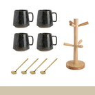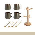 This complete set includes four stoneware mugs, four matching spoons, and a beautifully crafted wooden tree stand for elegant storage and display. The natural wood stand keeps everything organized while adding a warm, organic focal point to your kitchen or coffee station.
